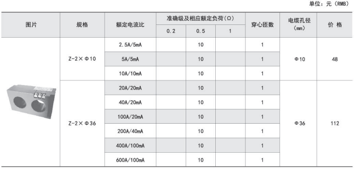 | 額定電流比(A) | 準確級 | 額定輸出(VA) |