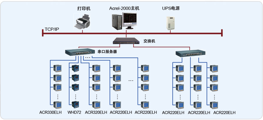 該院新建大樓系統(tǒng)分為配電室和樓層部分,配電室高壓部分采用ACR330ELH采集諧波數(shù)據(jù),WHD72采集溫濕度數(shù)據(jù);低壓進(jìn)線側(cè)采用ACR320ELH采集諧 波、功率因數(shù)等數(shù)據(jù), ACR220EK網(wǎng)絡(luò)電力儀表采集測(cè)量電流,開關(guān)狀態(tài)由輔助觸點(diǎn)接入ACR220EK儀表的DI(開關(guān)量輸入)接口。樓層部分由ACR220E采集電能數(shù)據(jù)。所有電參量數(shù)據(jù)由儀表的通訊接口經(jīng)RS-485總線傳給上位機(jī),實(shí)現(xiàn)遙測(cè)、遙控和遙信功能。
