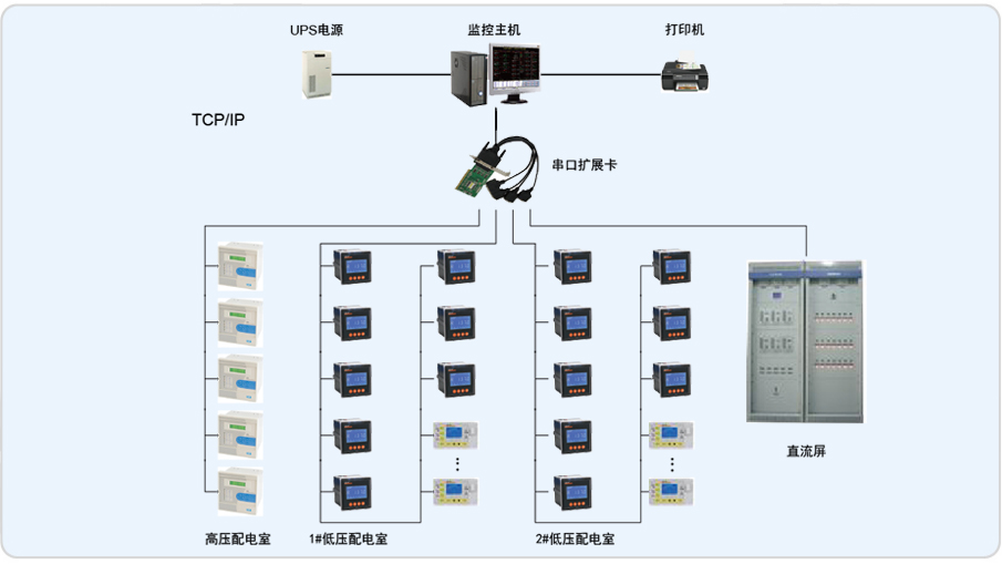 整個系統采用分布式結構,高壓配電室、低壓配電室1#、低壓配電室2#內現場設備均采用RS485總線直接接入監控主機擴展卡的串口。對于每個回路采用ACR多功能儀表,共126個回路;站控層應用國內知名的聯想商用計算機作為監控主機,同時設有用于報表打印輸出的打印機;防止異常斷電而引發的數據丟失的UPS設備。監控軟件平臺采用單機版Acrel-3000型電能管理系統。Acrel-3000型電能管理系統預留了擴展接口,可方便進行擴展。