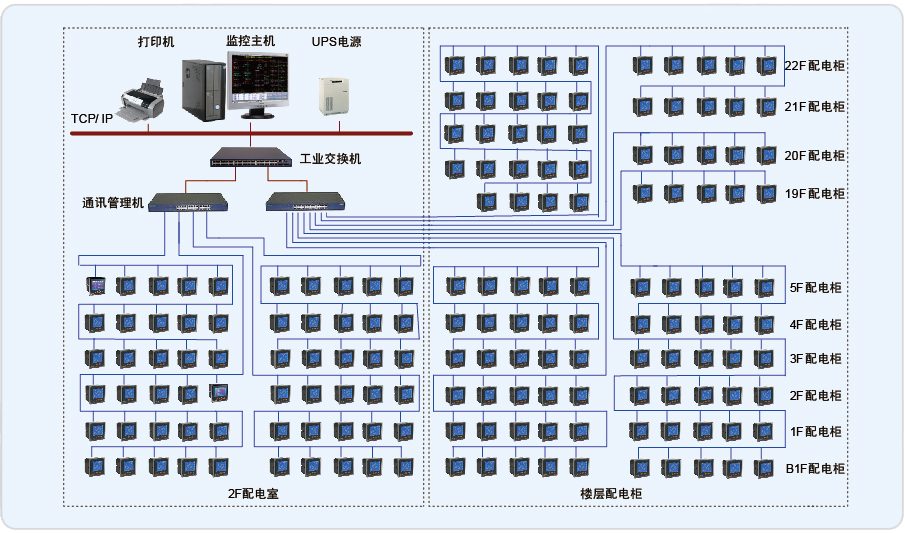 上海百樂門大酒店電力監控系統監控范圍為百樂門大酒店的22個樓層的PZ系列電力儀表和配電室的PZ、ACR系列電力儀表進行遠程監測?,F場設備全集中在同一個配電室中,業主的電氣值班室就近安排在配電室旁,本系統監控中心也安置在該值班室中。系統組網采用常見的3層結構,站控管理層、通訊管理層和現場設備層。