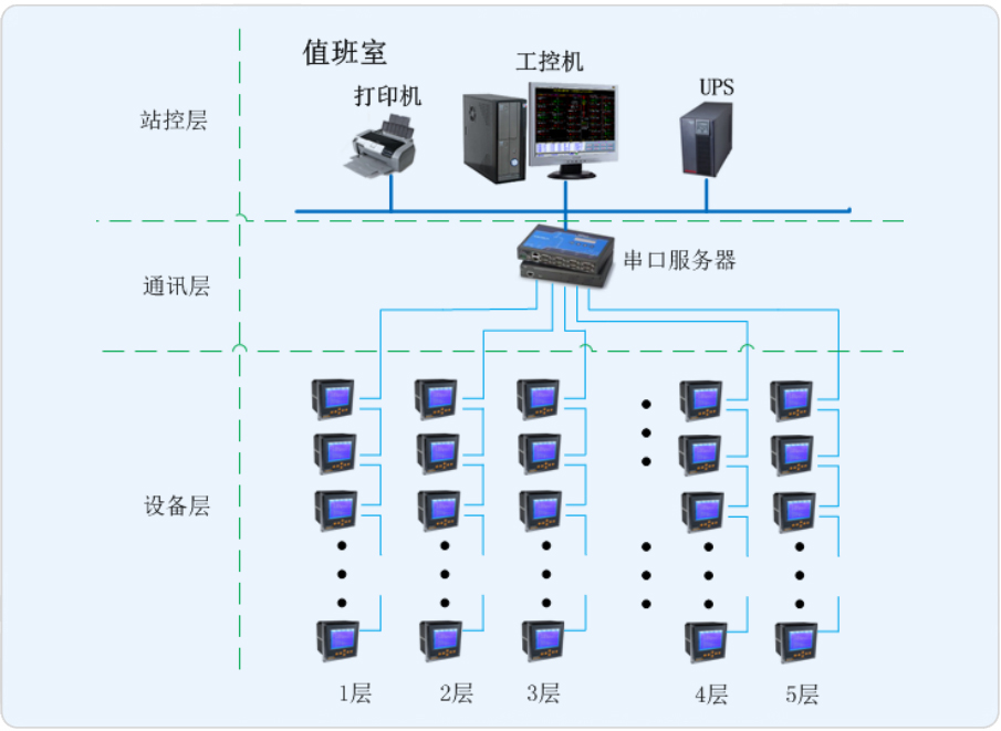 本項目是為羅店鎮(zhèn)市民服務(wù)中心樓層配電部分設(shè)計的電能管理系統(tǒng),監(jiān)控范圍為8層樓內(nèi)的多功能儀表?,F(xiàn)場多功能儀表通過總線接入值班室采集器,再將通過采集器連接到監(jiān)控主機,從而在監(jiān)控主機上實現(xiàn)總線上儀表與監(jiān)控主機的數(shù)據(jù)連通。通過Acrel-3000電能管理系統(tǒng)對樓層用電環(huán)節(jié)進行記錄與統(tǒng)計,借助計算機輔助手段進行集抄,節(jié)省人工成本。